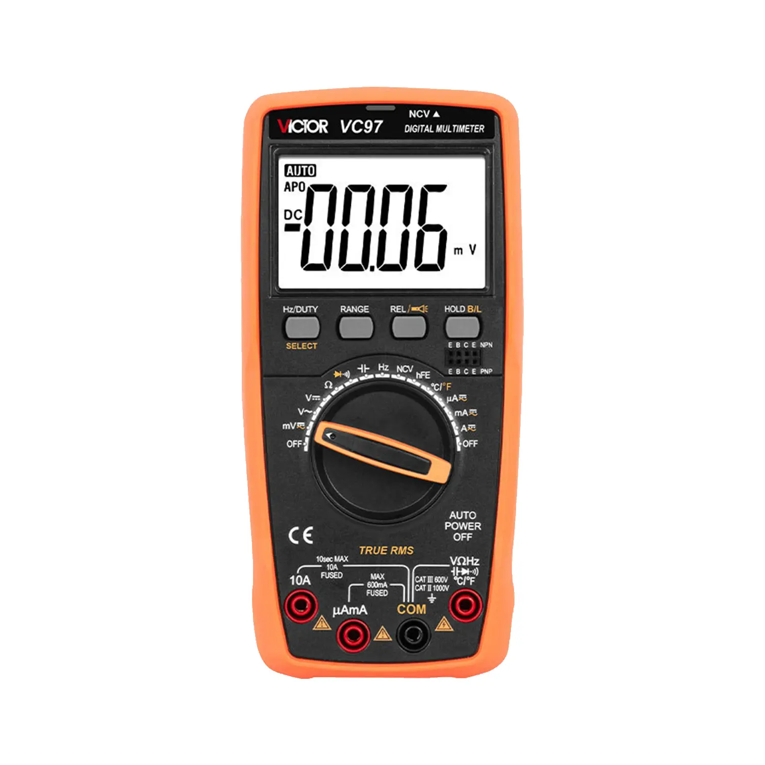 مولتی متر اتورنج ویکتور VICTOR مدل VC97 NEW یکی از کاربردی ترین و اصلی ترین تجهیزات دقیق تست و اندازه گیری جهت تعمیرات، تولید و راه اندازی در آموزشگاه ها، آزمایشگاه ها، صنایع، کارخانجات، کارگاه های تولیدی و تعمیرگاه های برق و الکترونیک محسوب می‌شود و از طریق آن می‌توان ولتاژ، جریان، مقاومت الکتریکی، ظرفیت خازنی، فرکانس و دما را اندازه گیری نمود.