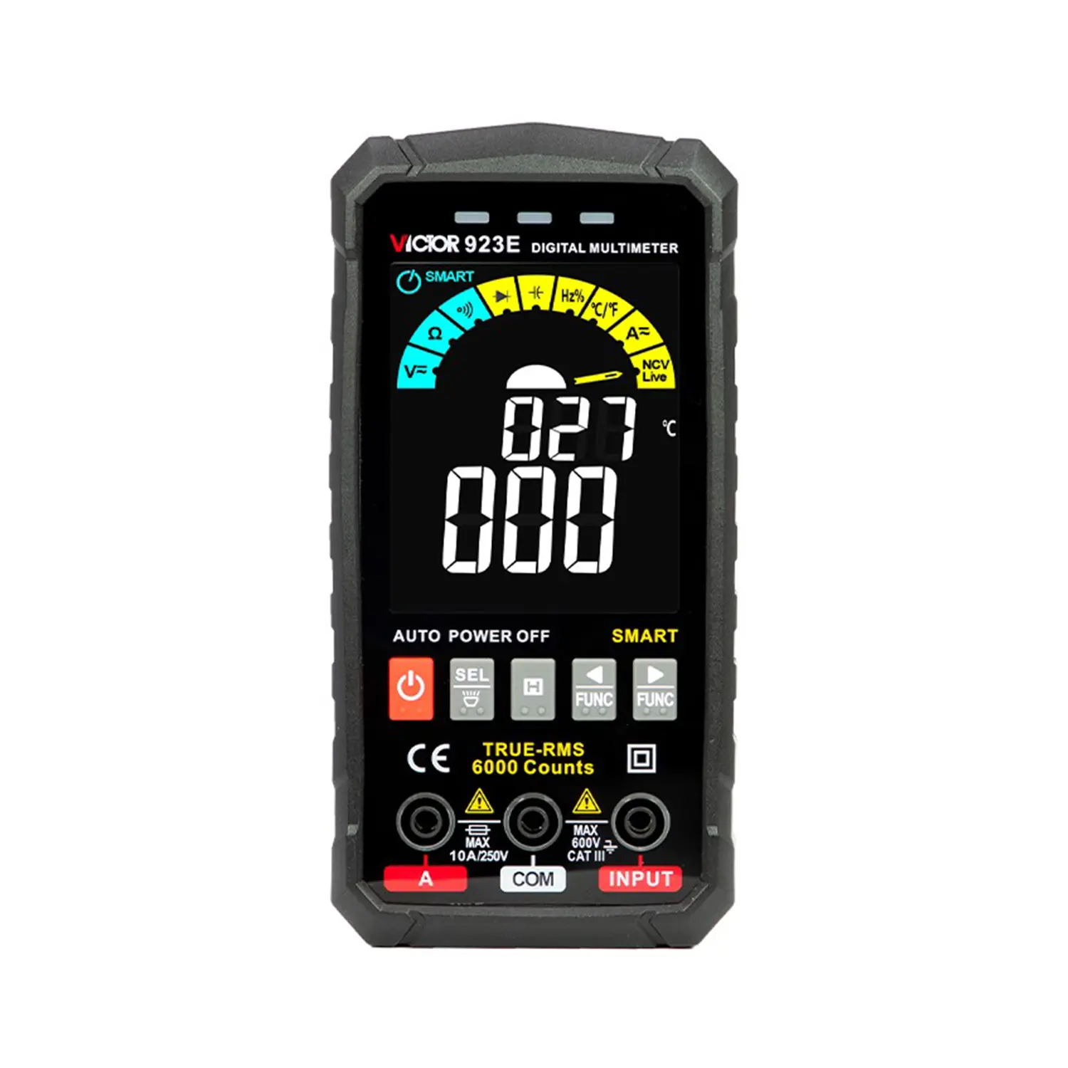 یکی از مولتی مترهای هوشمند و اتورنج تولید شده توسط شرکت ویکتور میباشد. از مزایای مولتی متر VICTOR 923E میتوان به نمایشگر تمام صفحه، تعیین فانکشن (پارامتر اندازه گیری) به صورت خودکار Auto Function Detection (Smart) و تعیین رنج اندازه گیری به صورت اتوماتیک (Auto Range)، اندازه گیری جریان های الکتریکی تا 10A، اطلاع از وجود ولتاژ به صورت القائی NCV، فازمتر Live، ظرفیت خازن و میزان مقاومت الکتریکی و … اشاره کرد. مولتی متر 923E یکی از مولتی متر های دقیق با سایز کوچک و قابلیت Auto Scan میباشد.